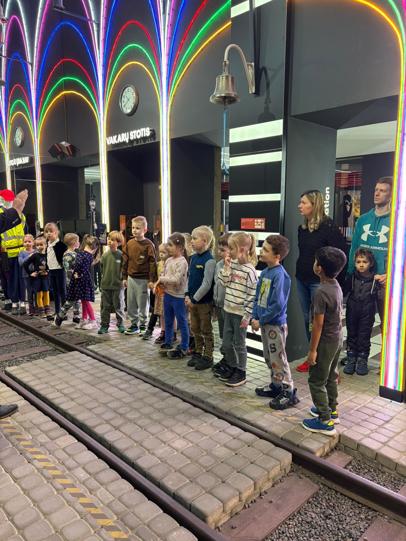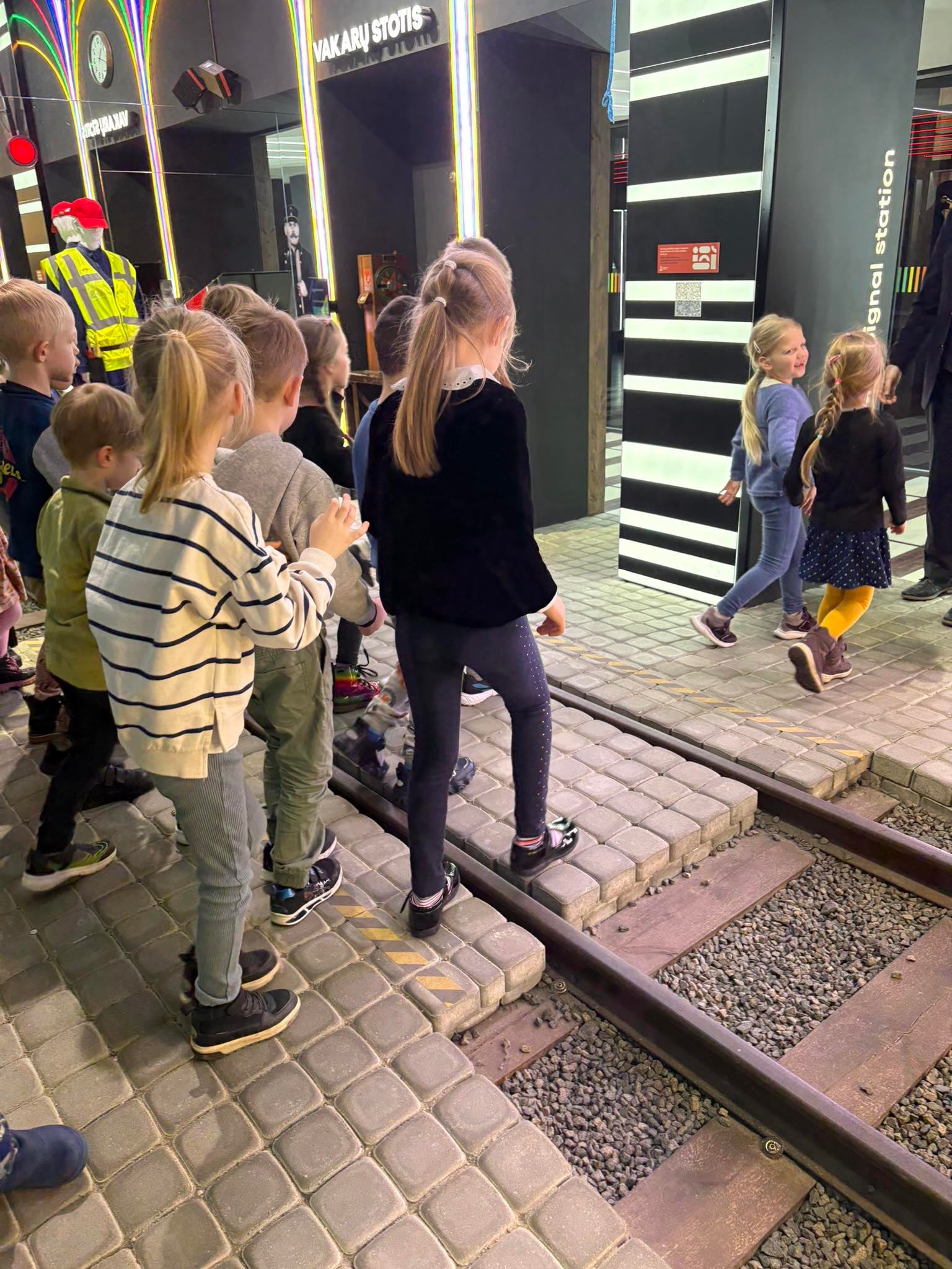 Vaikai dainavo dainelę „Tuk tuk tuk, mes važiuojame traukiniu“, susipažino su geležinkelio šviesoforais ir vėliavėlėmis. Taip pat mokėsi pereiti geležinkelį ir simboliškai suremontavo kelią.