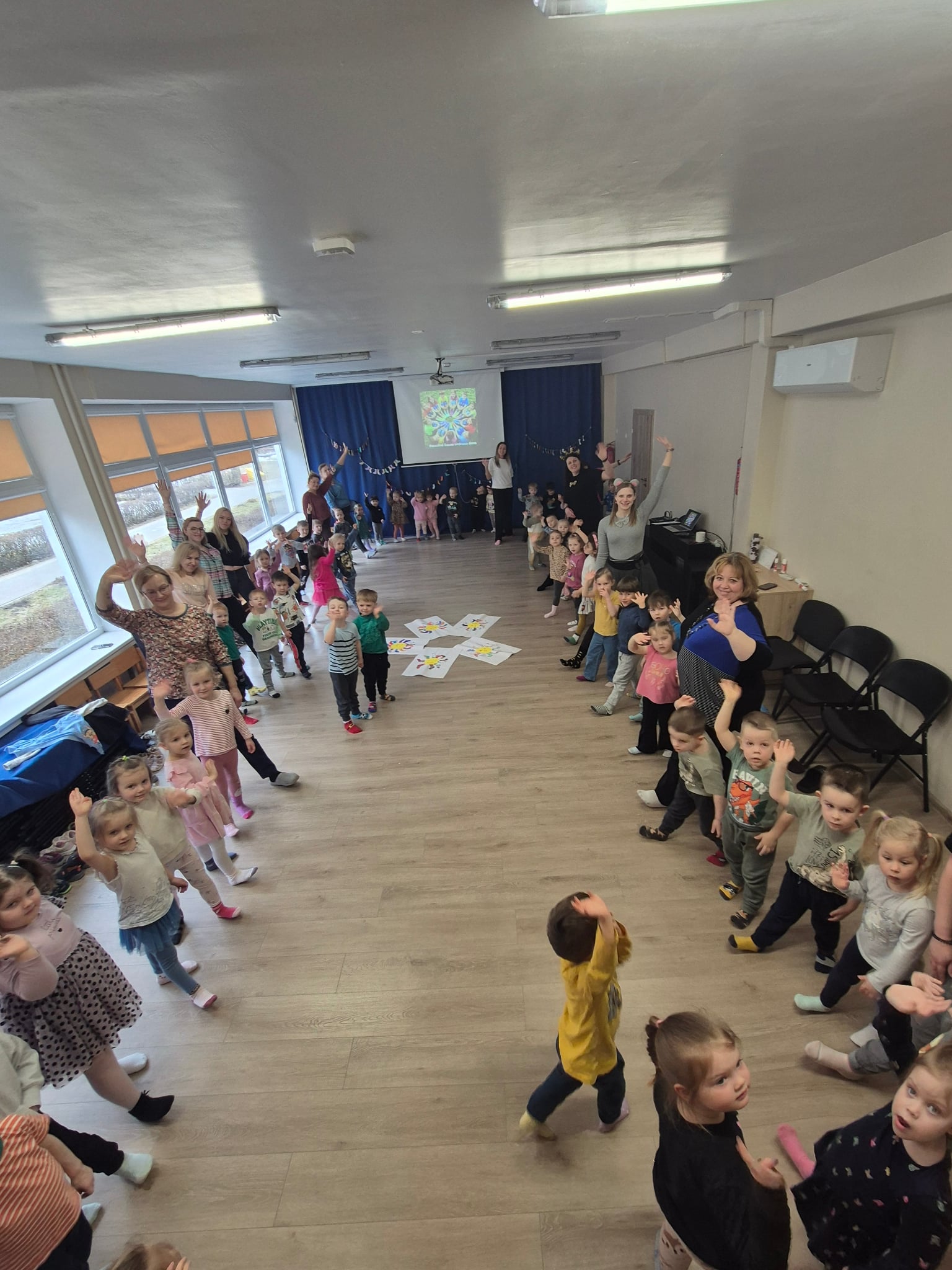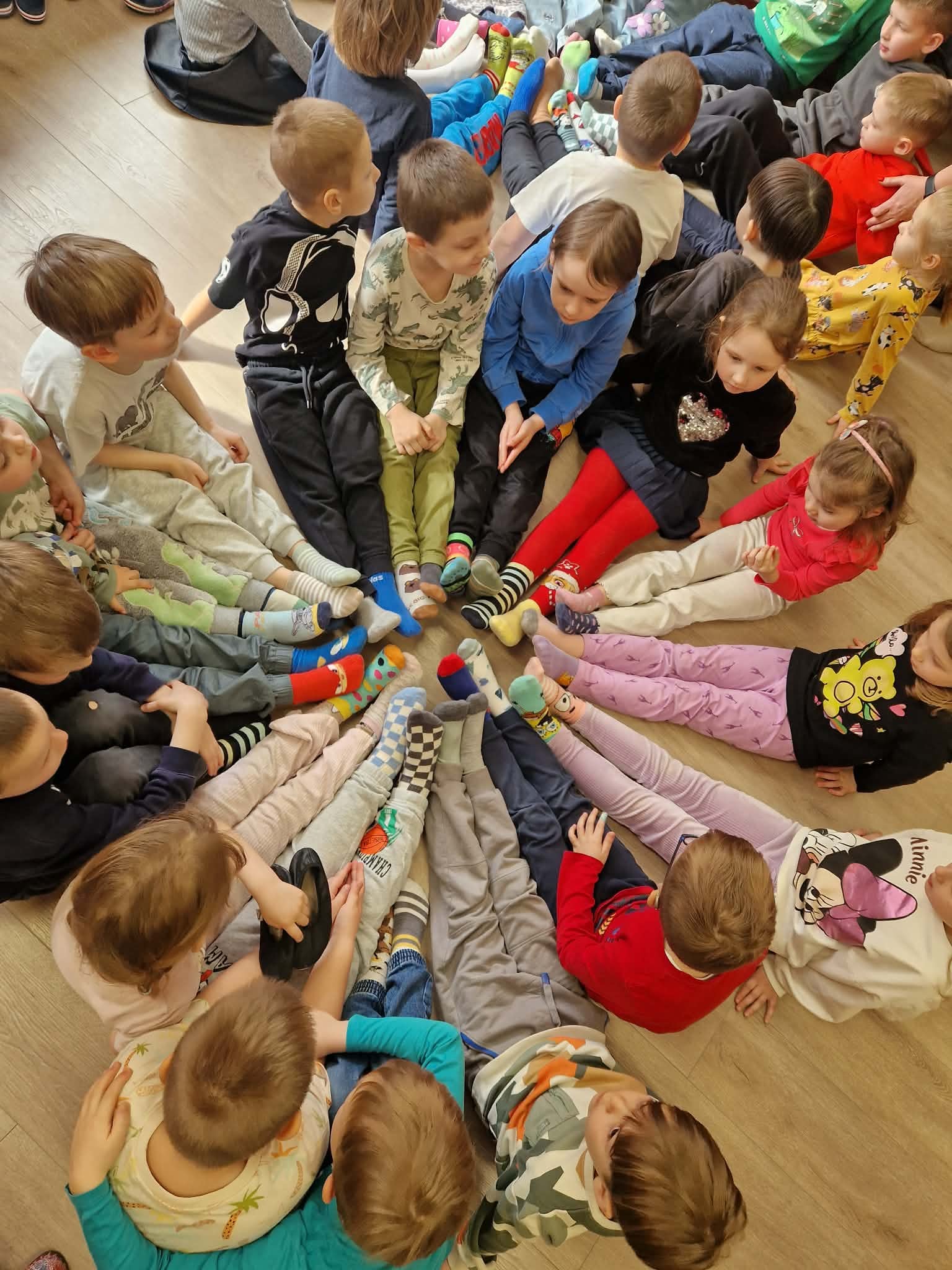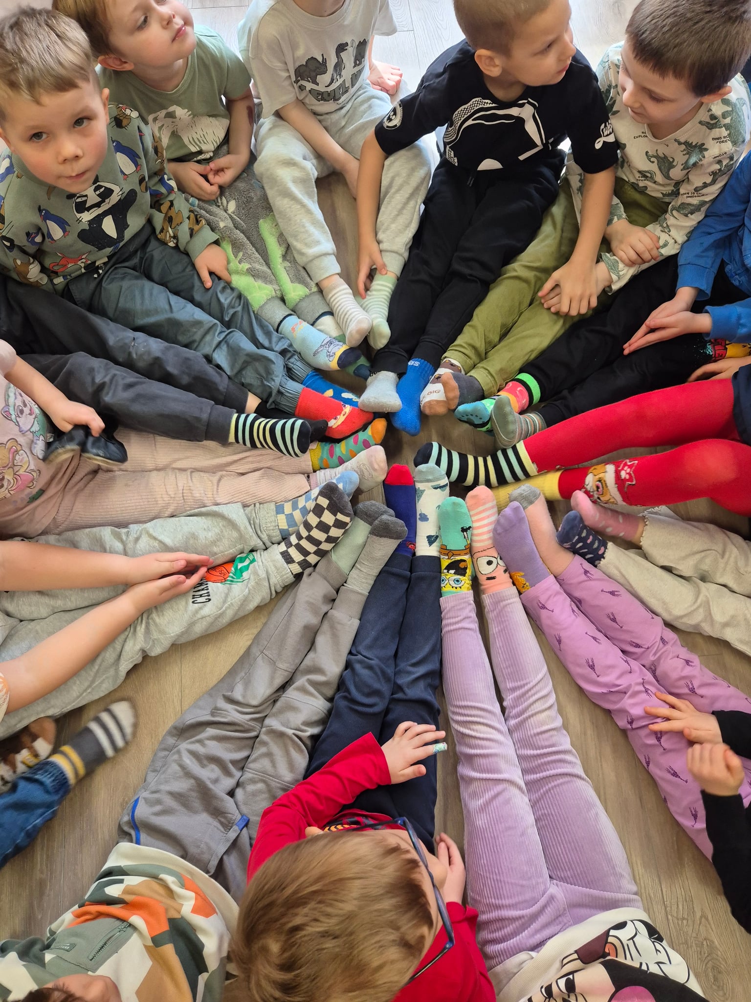 Vaikai į salę rinkosi pasipuošę skirtingomis kojinytėmis – spalvingu ir prasmingu palaikymo simboliu, primenančiu, kad visi esame skirtingi, ir dėl to pasaulis tampa gražesnis. Kartu su pelyte ir žirafėle ( labai geros draugės nors ir tokios nepanašios J) – kalbėjomės apie skirtumus. Apie žmones. Apie pasaulį. Apie tai, kad vieni esame garsesni, kiti – tylesni, vieniems lengviau bėgti, kitiems – apkabinti. Kad skirtumai ne skiria, o praturtina ir, kad labai svarbu priimti, suprasti ir draugauti. Mažieji žiūrėjo teminį filmuką, šoko linksmą „Skirtingų kojinyčių šokį“, kūrė spalvingą palaikymo saulytę ir sukosi vienijančiame draugystės ratelyje.