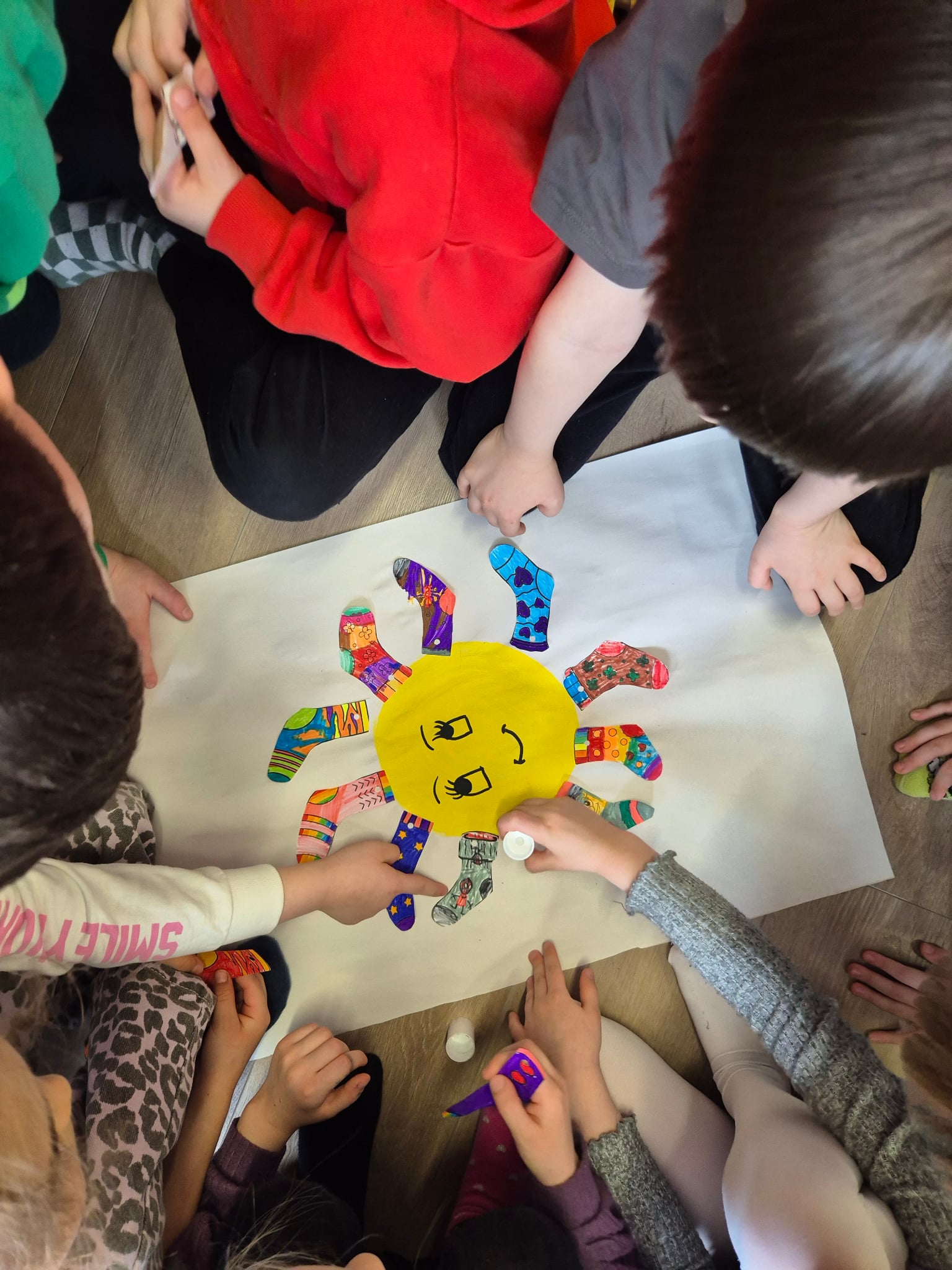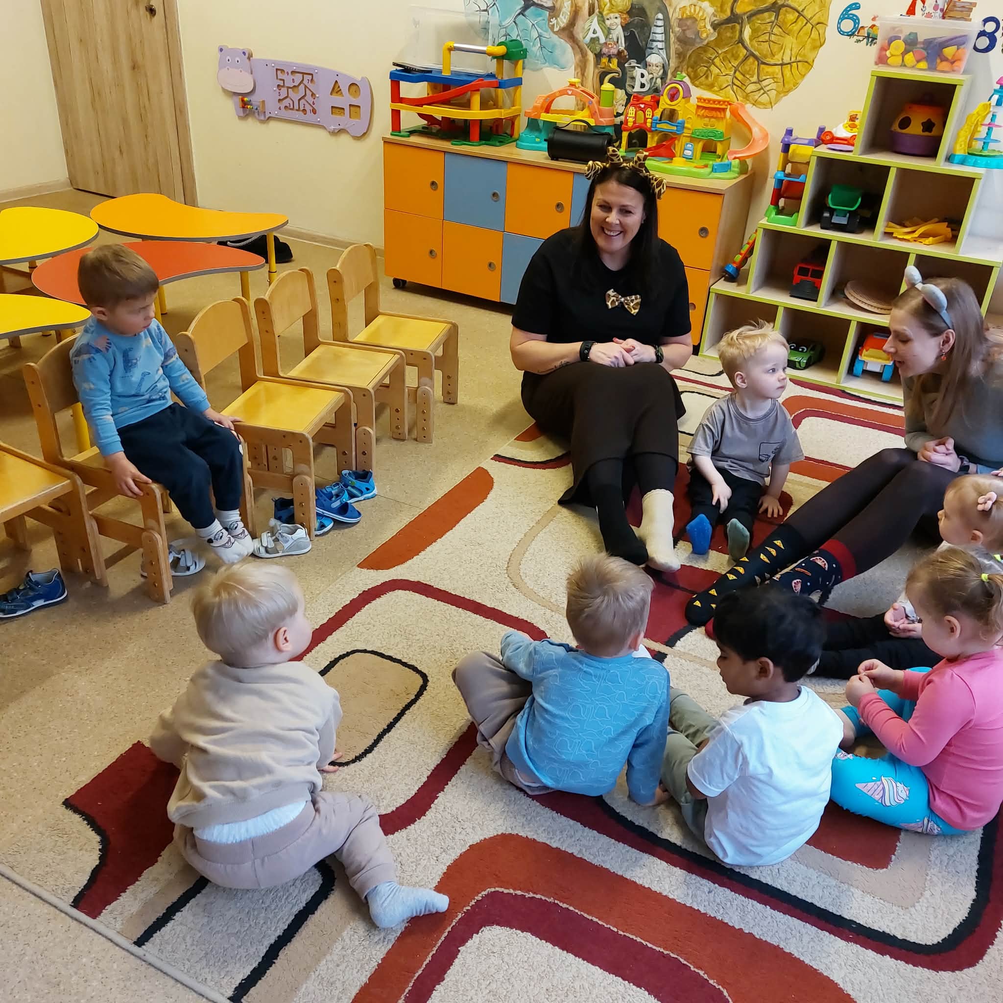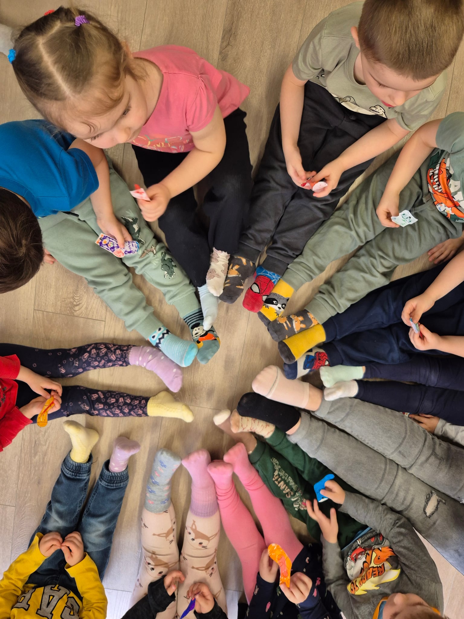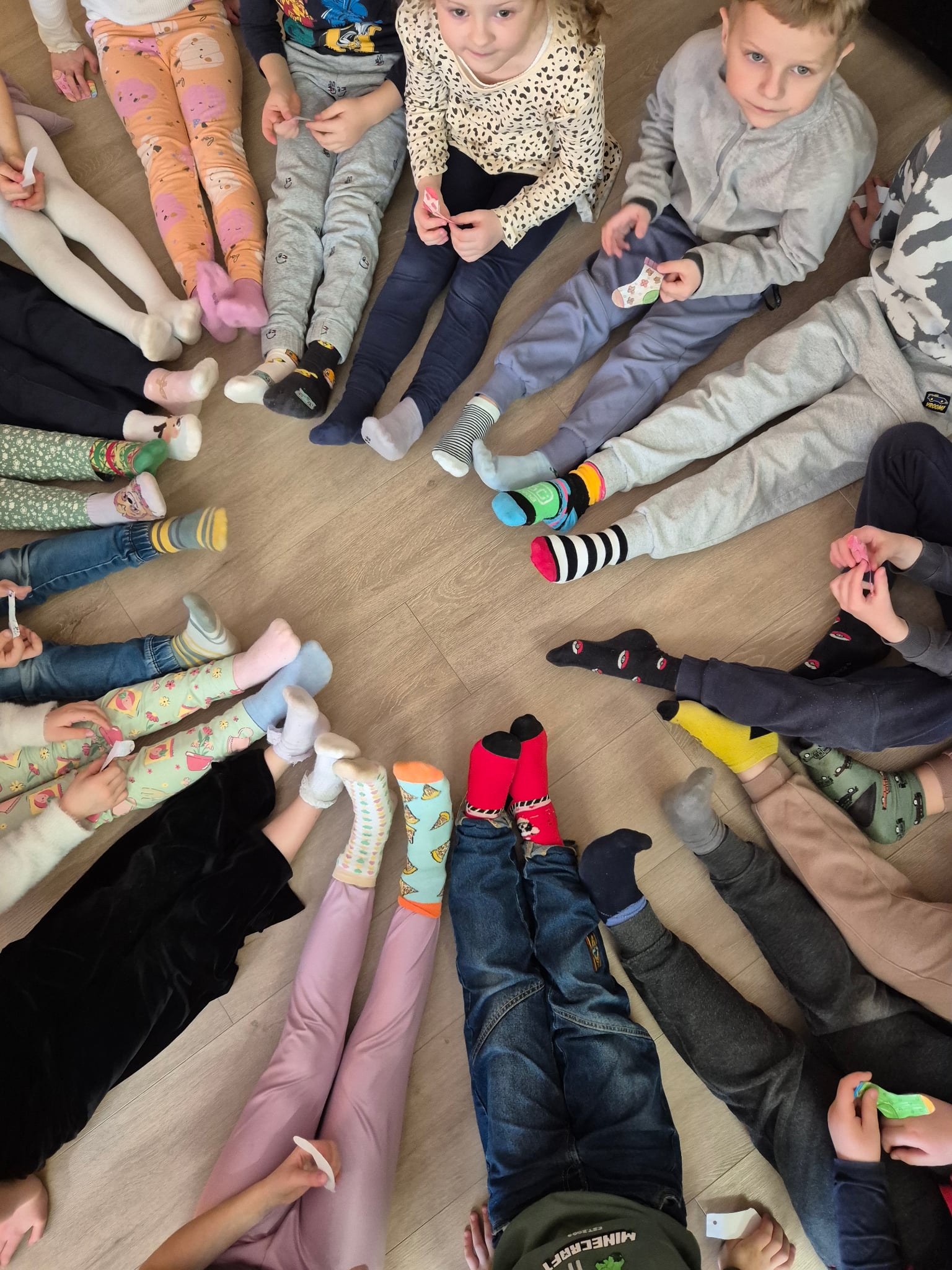 Vaikai į salę rinkosi pasipuošę skirtingomis kojinytėmis – spalvingu ir prasmingu palaikymo simboliu, primenančiu, kad visi esame skirtingi, ir dėl to pasaulis tampa gražesnis. Kartu su pelyte ir žirafėle ( labai geros draugės nors ir tokios nepanašios J) – kalbėjomės apie skirtumus. Apie žmones. Apie pasaulį. Apie tai, kad vieni esame garsesni, kiti – tylesni, vieniems lengviau bėgti, kitiems – apkabinti. Kad skirtumai ne skiria, o praturtina ir, kad labai svarbu priimti, suprasti ir draugauti. Mažieji žiūrėjo teminį filmuką, šoko linksmą „Skirtingų kojinyčių šokį“, kūrė spalvingą palaikymo saulytę ir sukosi vienijančiame draugystės ratelyje.